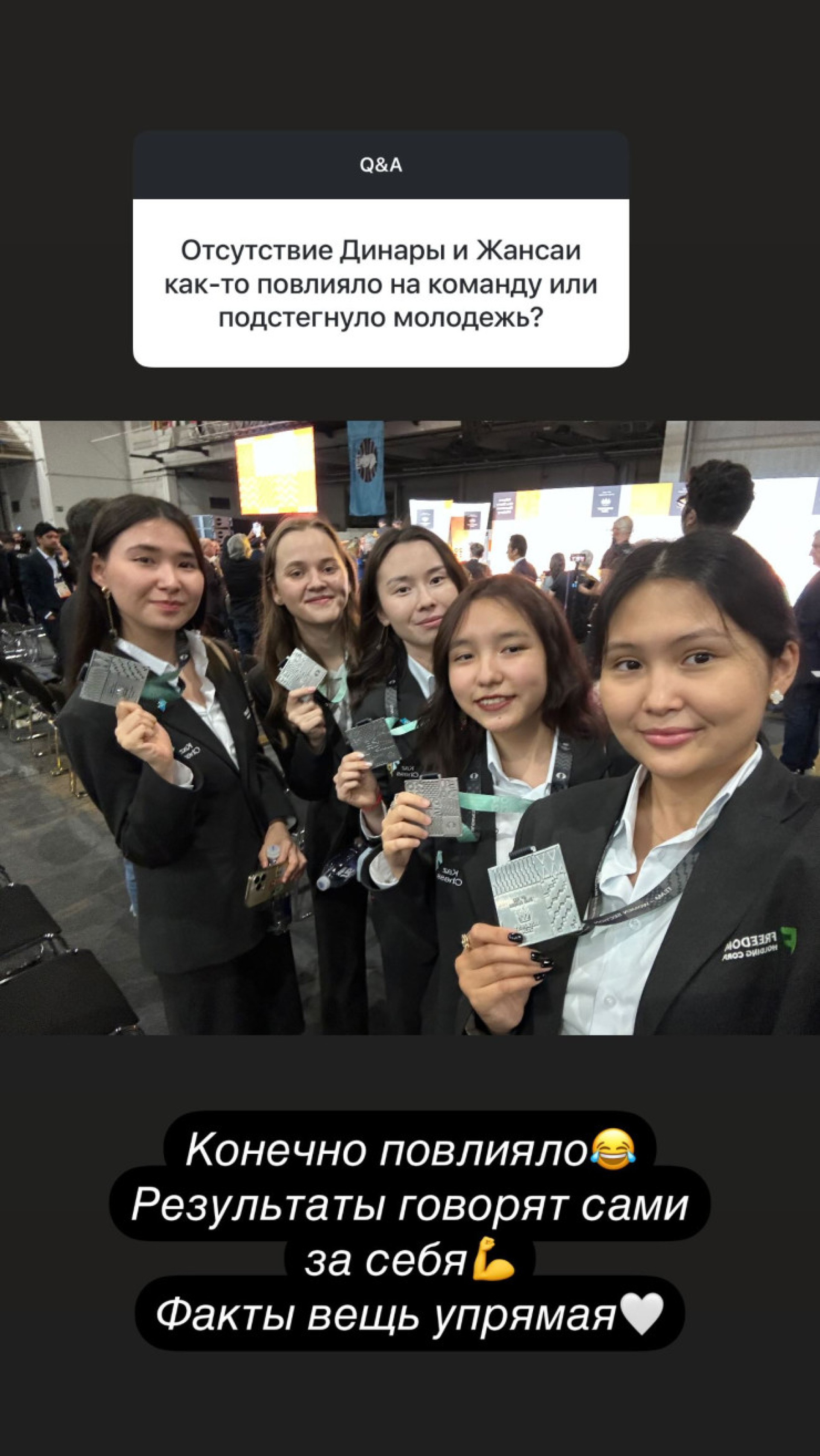 Асаубаева в социальных сетях отметила, что отсутствие Абдумалик, по её мнению, положительно сказалось на результатах команды. В эксклюзивном интервью она подтвердила, что их отношения не изменились, и добавила: