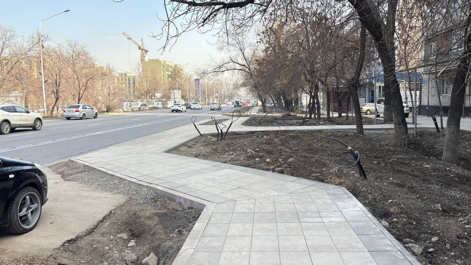 Проект BRT на проспекте Райымбека реализуют по принципу "от фасада до фасада". На обеих сторонах улицы уже видны новые бордюры и уложенная брусчатка. При этом участки газона пока остаются неухоженными, а кабели для будущего освещения всё ещё находятся на поверхности.
