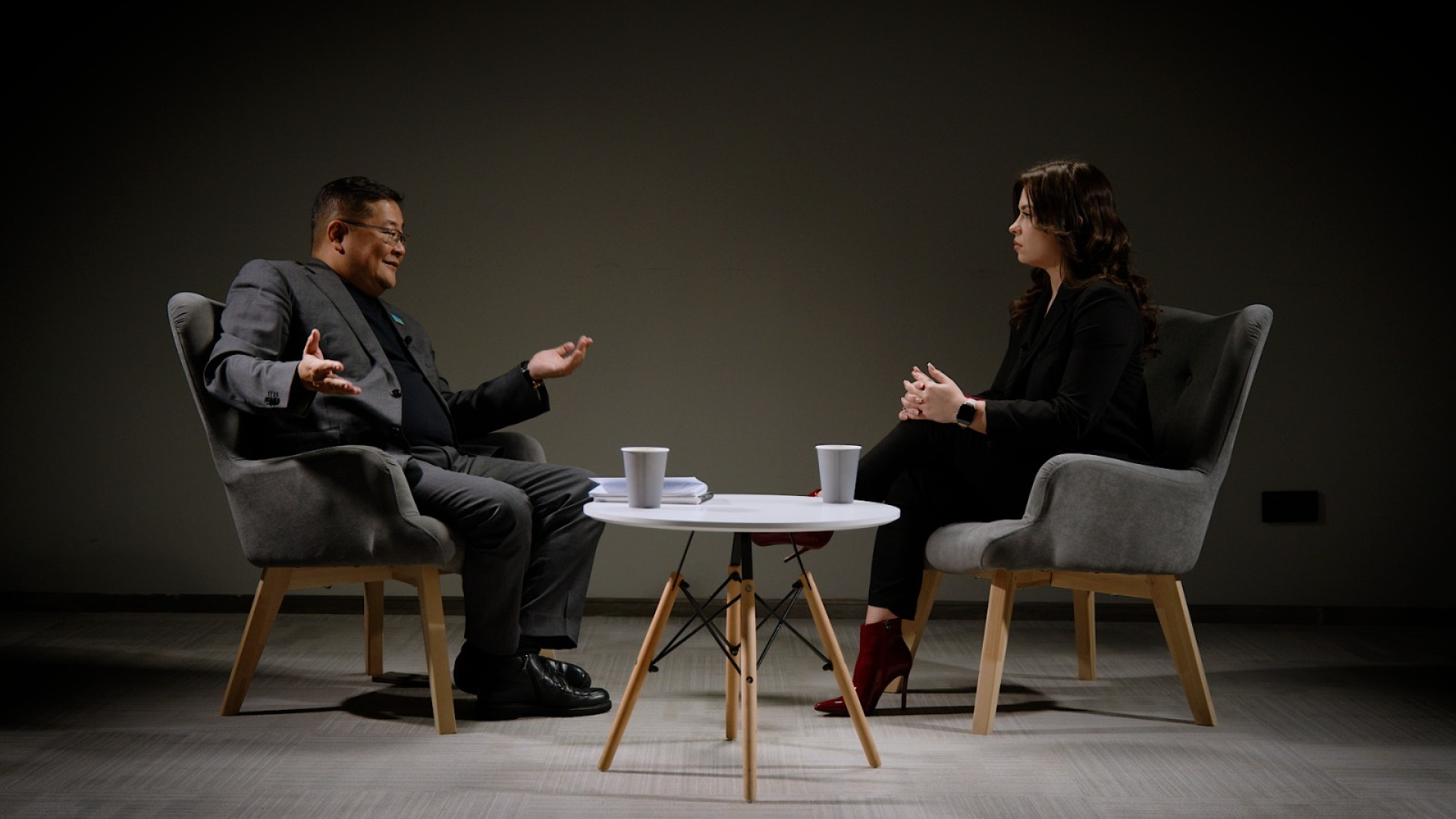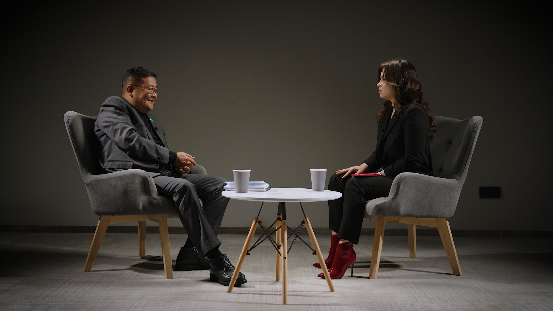 Депутат Мажилиса Айдос Сарым и корреспондент Елизавета Аксенова. Фото: ©️ / Роман Павлов