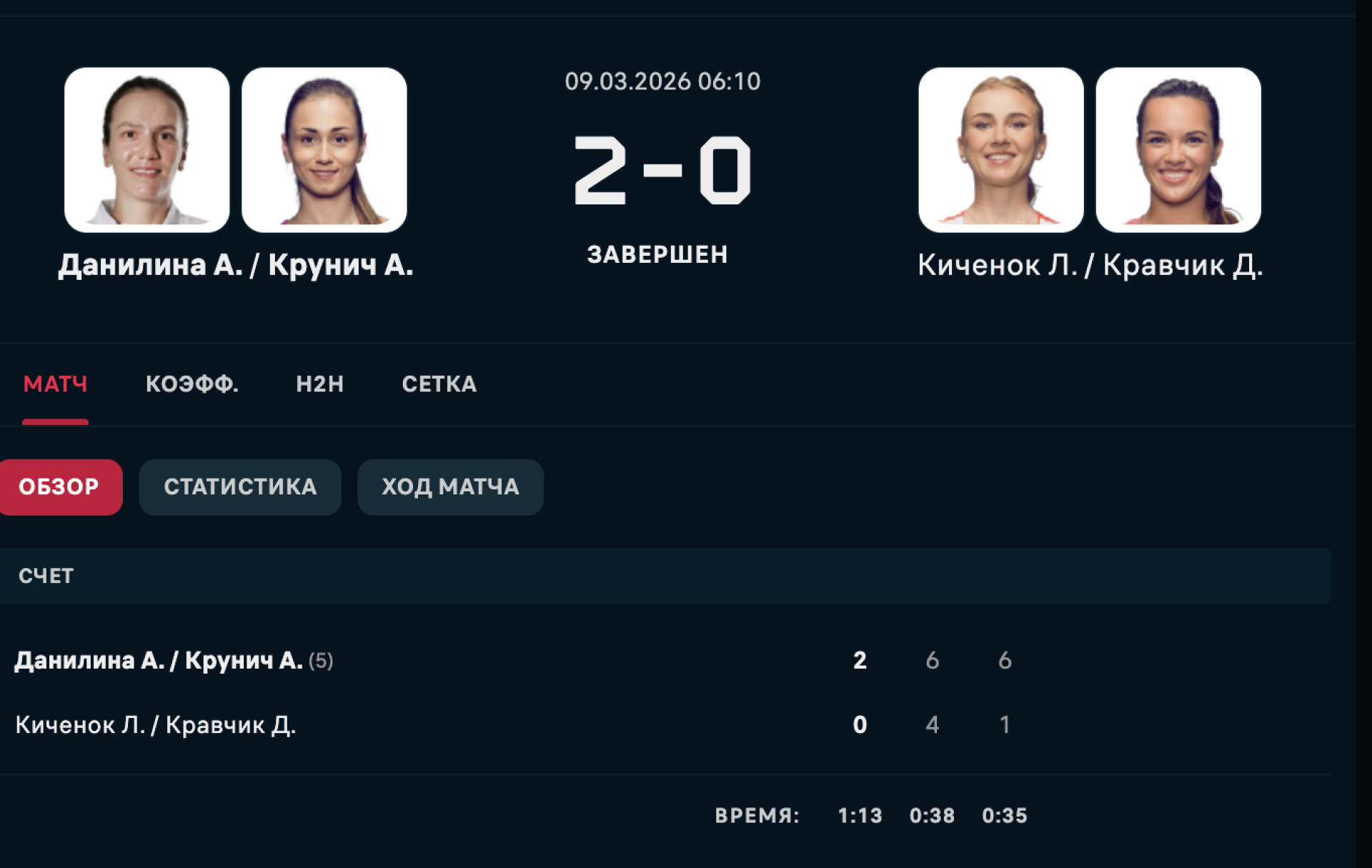 В ходе матча казахстанская теннисистка и её партнёрша выполнили два эйса, допустили четыре двойные ошибки и реализовали четыре из 11 брейк-пойнтов. Время, проведённое на корте, составило 1 час 13 минут.