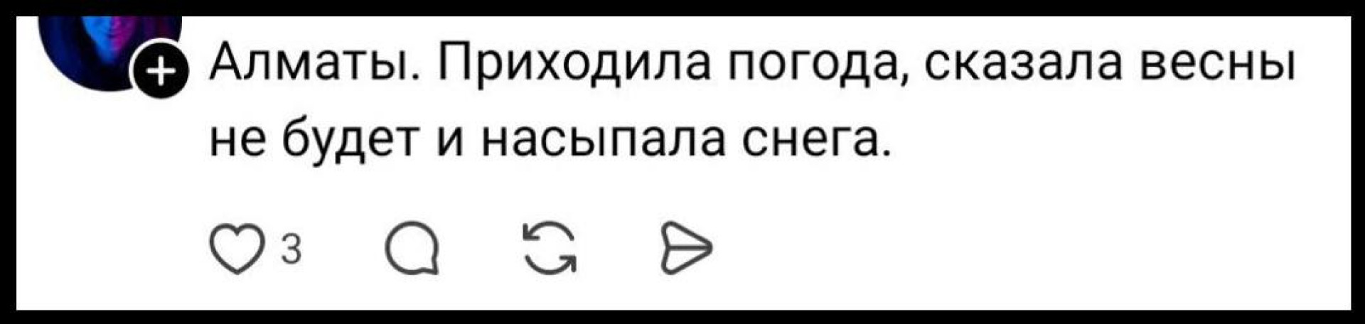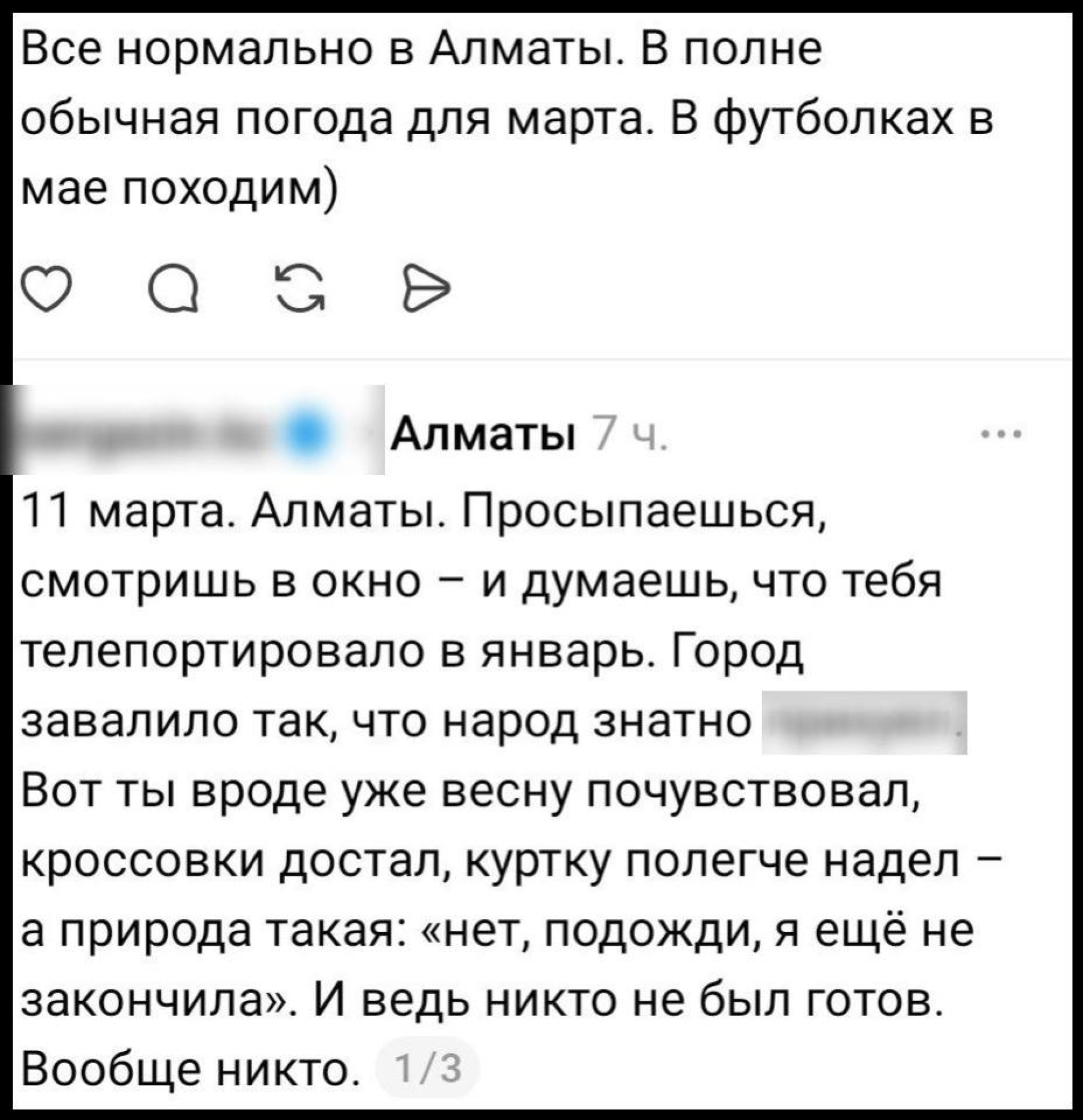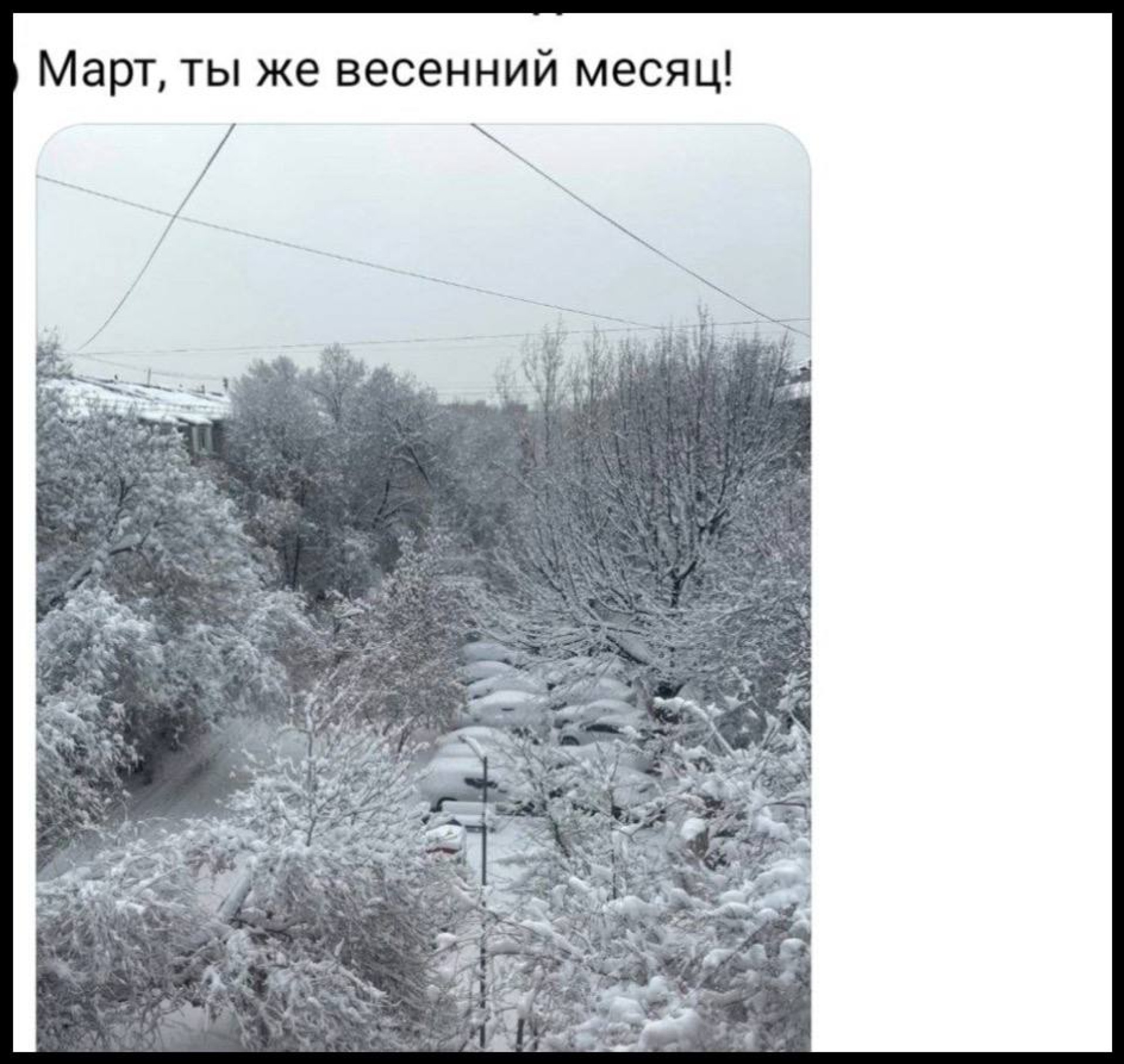 Не обошлось без шуток и иронии. Жители делятся своим мнением о заснеженном марте. Одни пишут, что такая погода вполне нормальна для этого времени года, и предлагают просто радоваться красивому снегу и зимней атмосфере. Другие же признаются, что уже устали от холодов и хотят, чтобы весна наконец вступила в свои права.