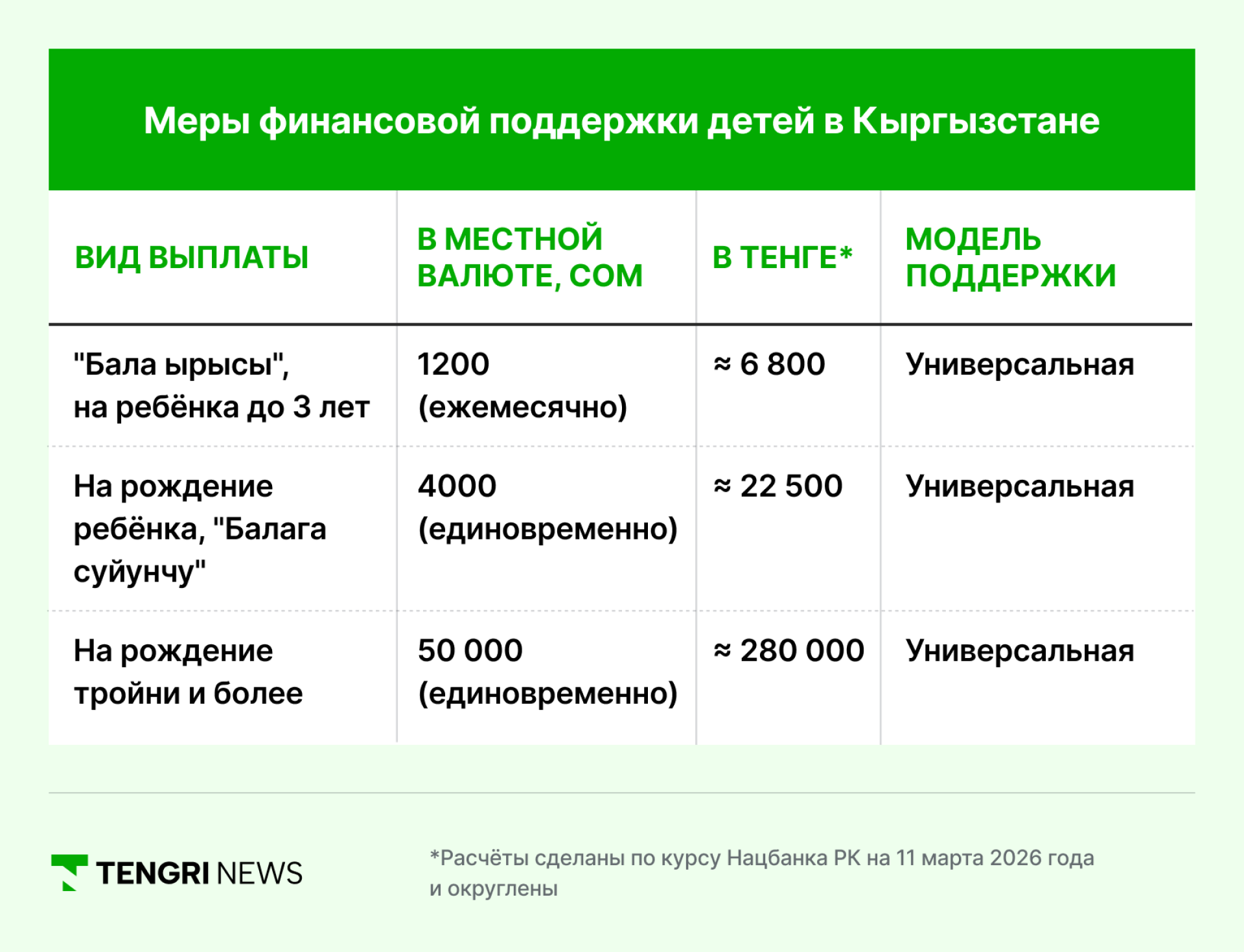 С 1 июля 2026 года в Кыргызстане запускается новая универсальная выплата "Бала ырысы" — по 1200 сомов (около 6 800 тенге) в месяц на каждого ребёнка до трёх лет, независимо от дохода семьи.