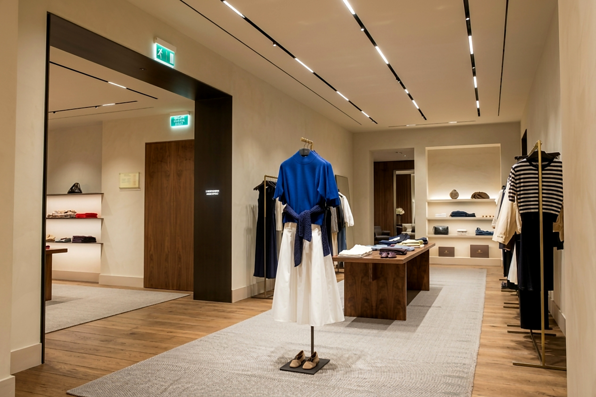 Новый магазин воплотил глобальную концепцию бренда, акцентируя внимание на "тихой роскоши" с использованием благородных материалов и продуманной геометрии. Главной визуальной особенностью стали массивные входные двери из темного дерева высотой четыре метра, которые создают атмосферу спокойствия и гармонии, оставляя суету мегаполиса за пределами.