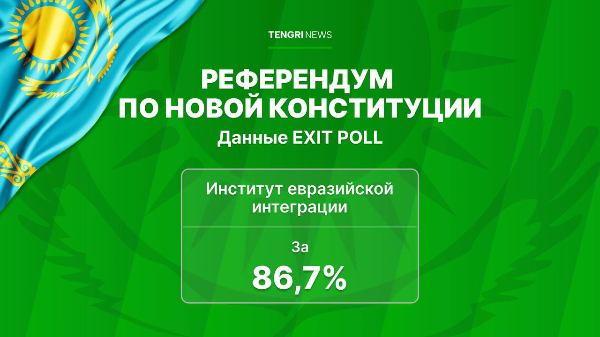 По данным экзитпола Института евразийской интеграции, за принятие новой Конституции проголосовали 86,7 процента из 30 тысяч опрошенных граждан. Явка составила 75,3 процента. Статистическая погрешность данных экзитпола составляет ±1 процент.