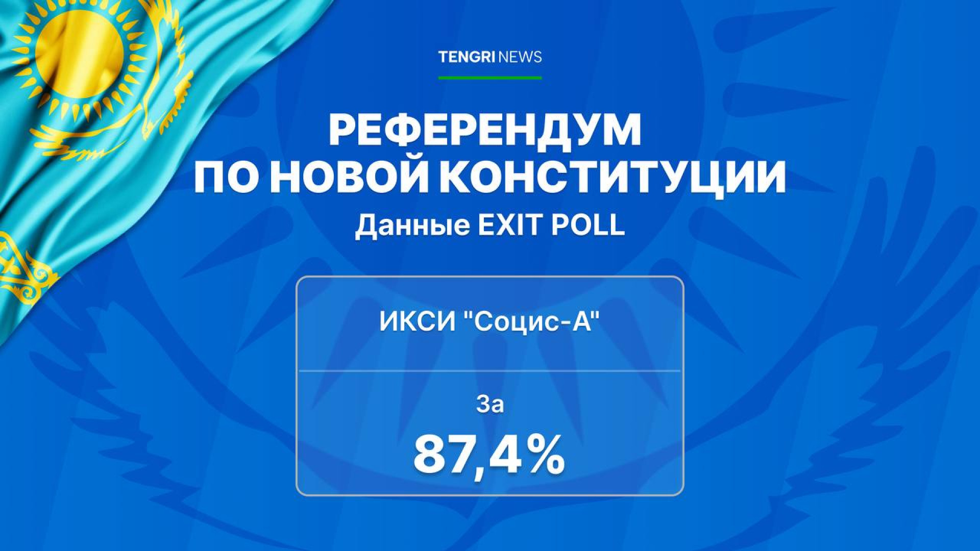 Согласно опросу Института комплексных социальных исследований – Астана "Социс-А", за принятие новой Конституции проголосовали 87,4 процента от числа опрошенных граждан. Явка на участках составила 73,8 процента. Социологическая погрешность данных составляет ±1,5 процента.