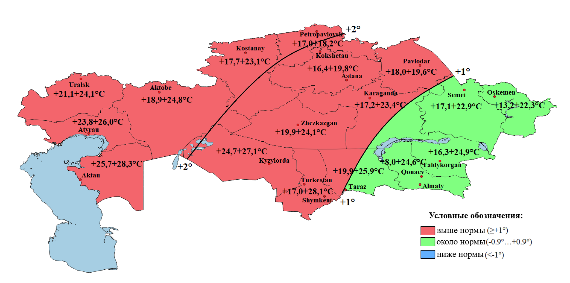 на западе (Западно-Казахстанская, Атырауская, Мангистауская области и Актюбинская области) ожидается жара выше нормы на 1–2 градуса.