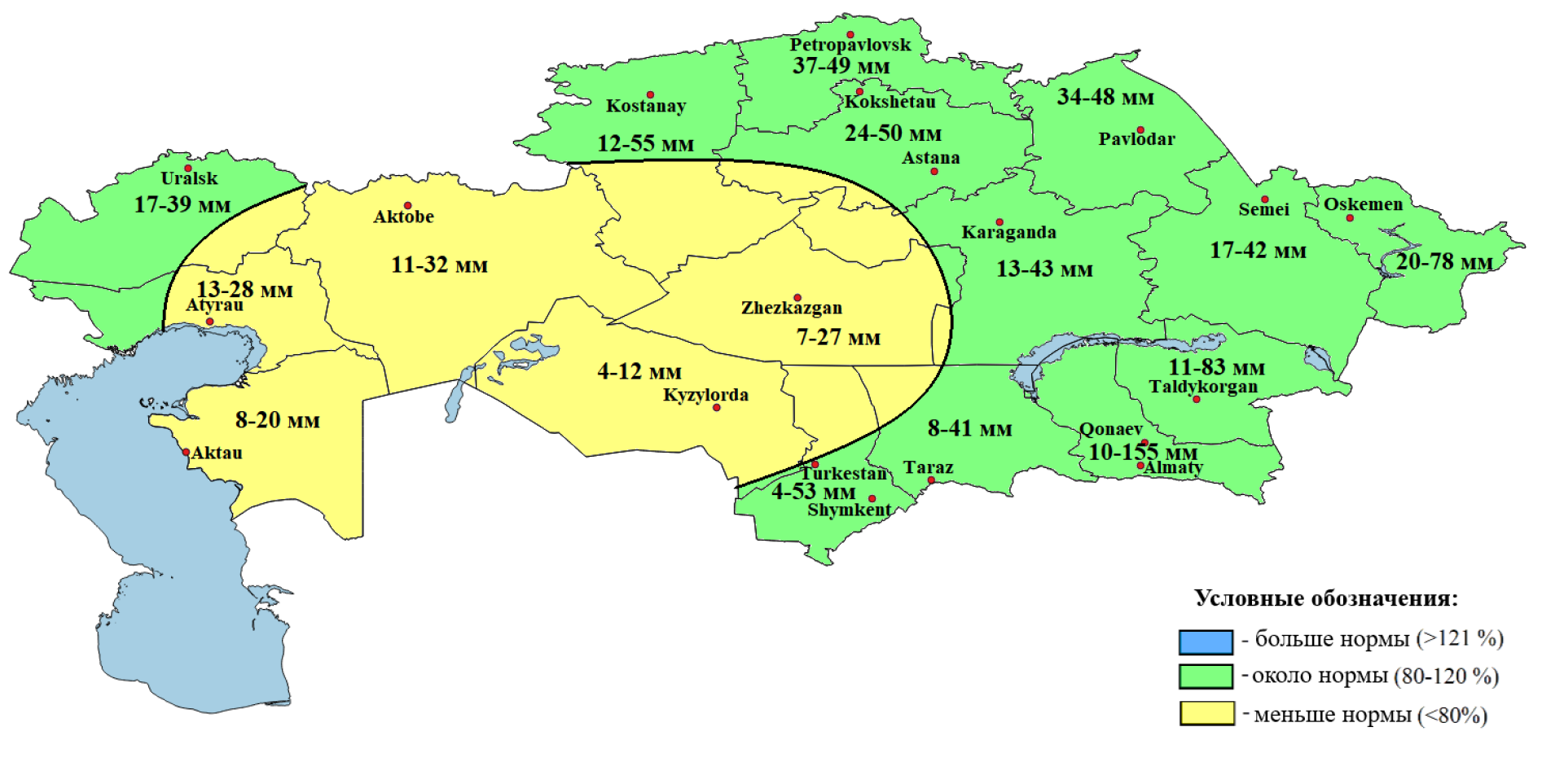 - меньше нормы — в северных регионах (Костанайская, СКО, Акмолинская), а также частично в западных и центральных областях.