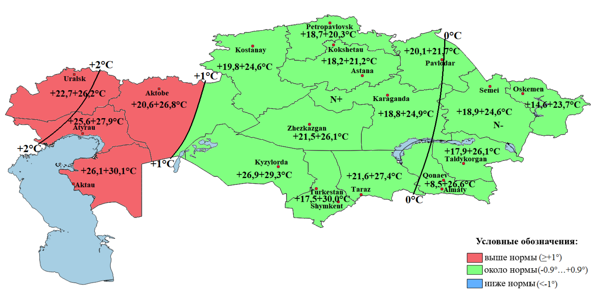 В сентябре температура будет выше нормы примерно на 1 градус почти по всей стране. Около нормы – в Жамбылской, Алматинской, областях Жетысу и Абай, в Восточно-Казахстанской, Павлодарской, на большей части Карагандинской, в восточной половине Туркестанской и области Улытау, на юго-востоке Акмолинской области, на крайнем юго-востоке Северо-Казахстанской области.