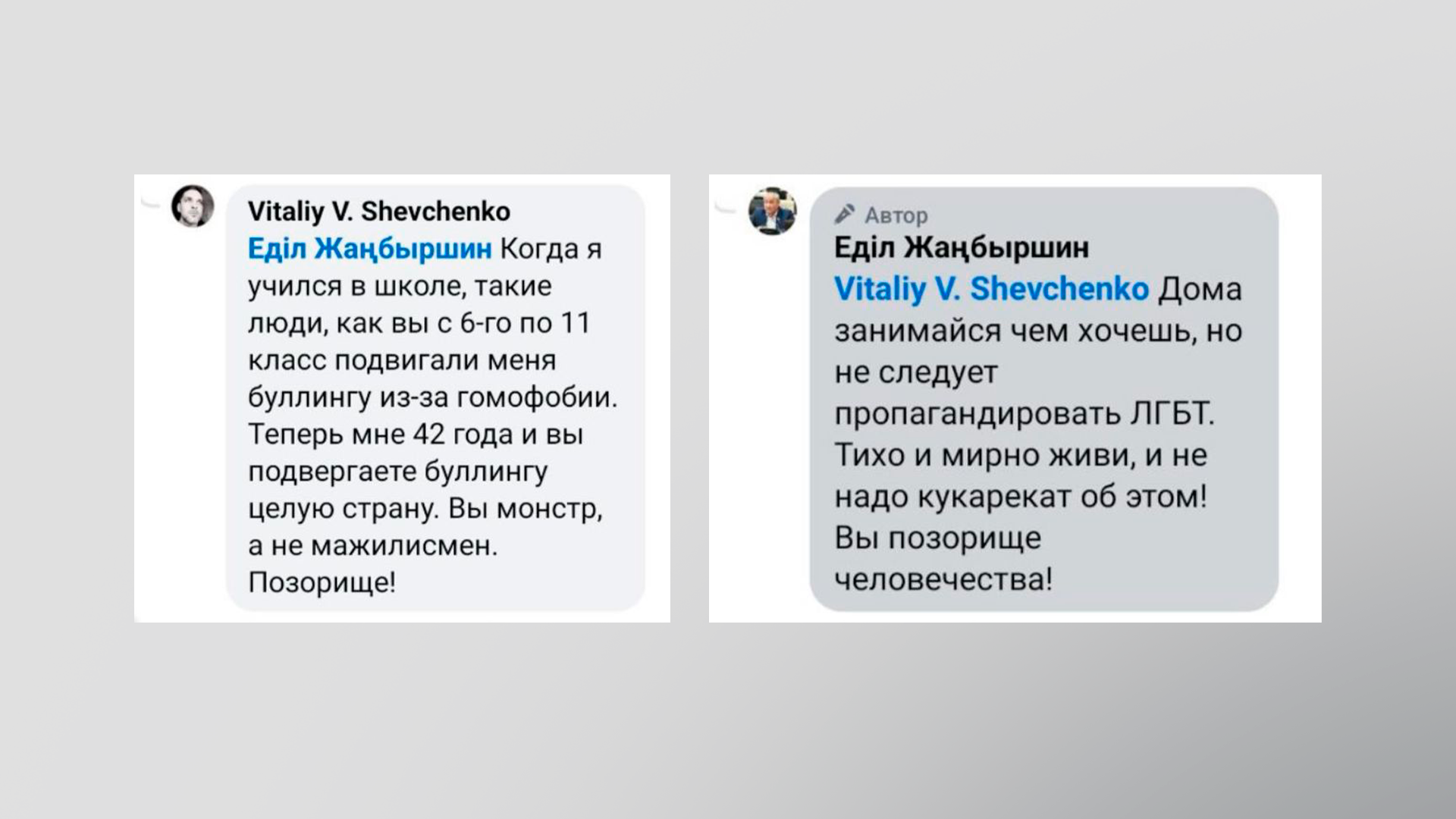 Виталий Шевченко подал иск в связи с тем, что Жанбыршин призвал его "не кукарекать" и назвал "позором человечества" в комментариях к своему посту в Facebook, посвящённому запрету пропаганды ЛГБТ в Казахстане.