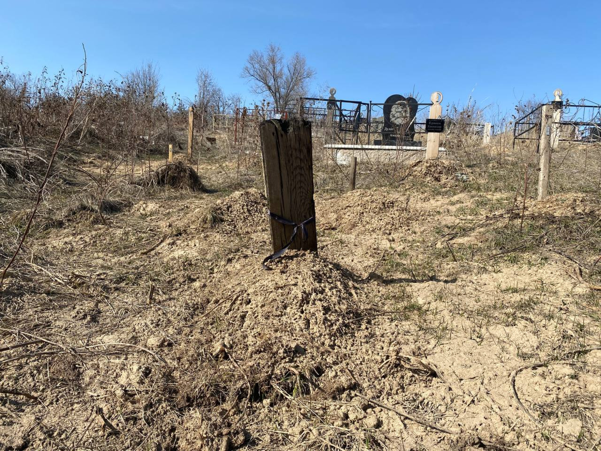 А на некоторых таких могильных столбиках и вовсе нет никаких номерков — только повязанная лента.