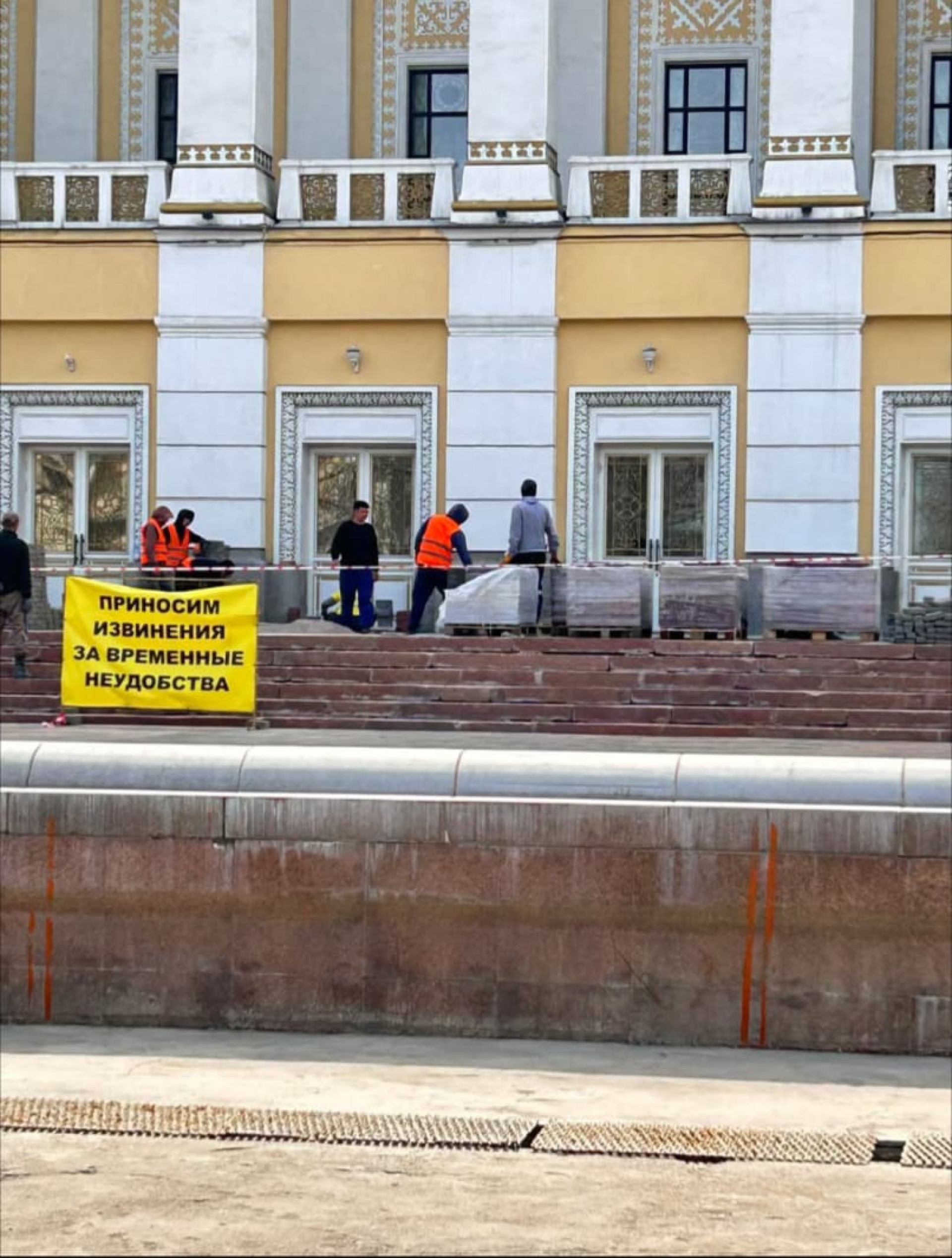 В пресс-службе городского акимата прокомментировали ситуацию, отметив, что в настоящее время ведутся работы по рихтовке брусчатки у парадного входа театра.