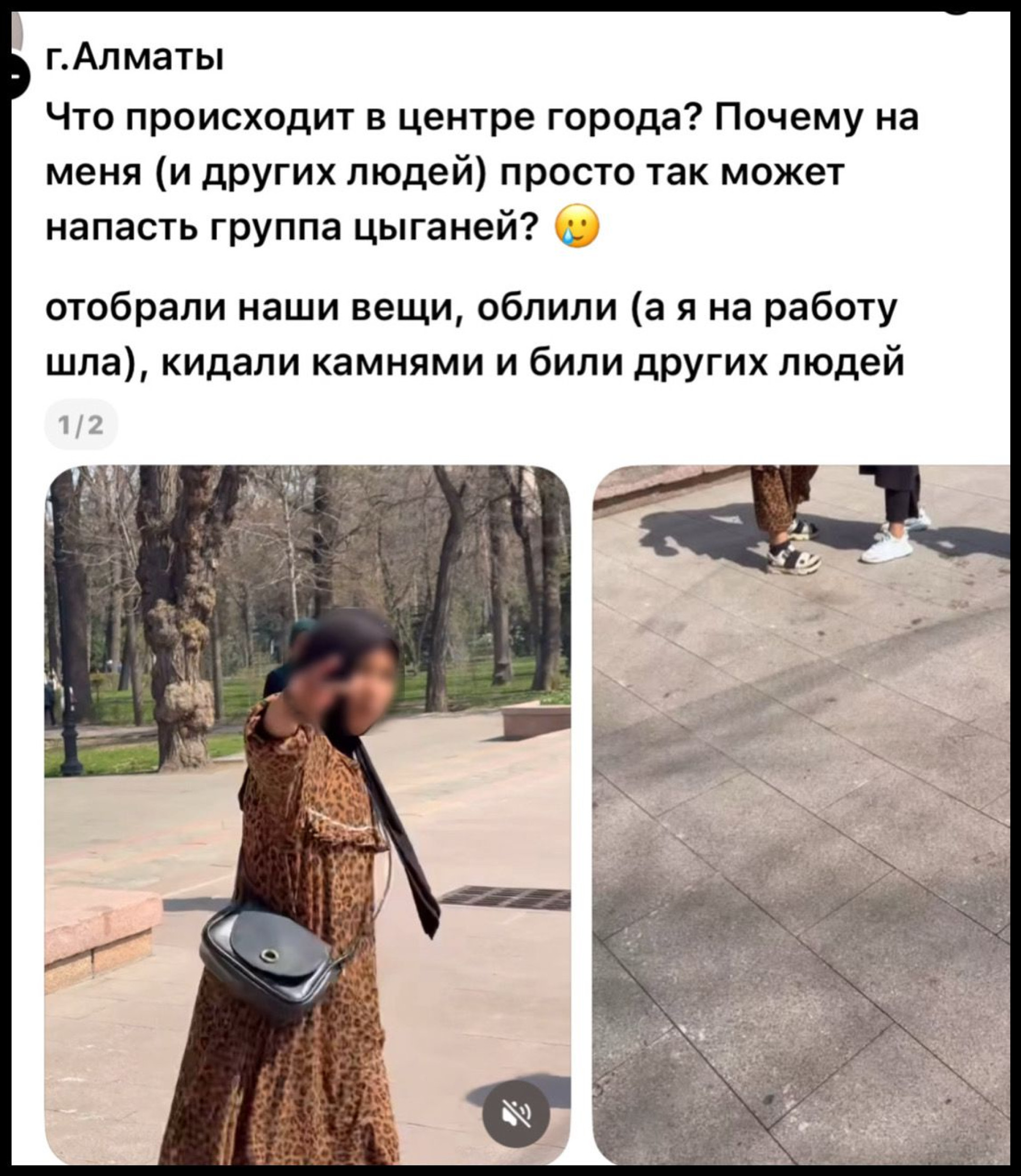 "Город Алматы. Что происходит в центре города? Почему на меня (и других людей) просто так может напасть группа детей? Отобрали наши вещи, облили (а я шла на работу), кидали камнями и били других людей," — поделилась автор поста.