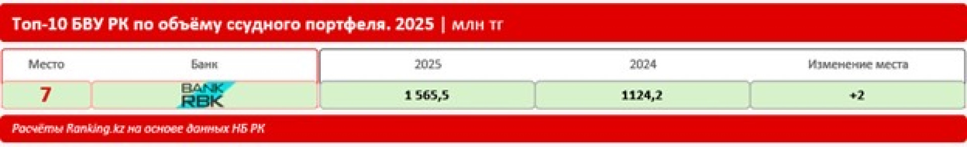 По итогам 2025 года Bank RBK улучшил свои позиции, поднявшись с девятого на седьмое место среди банков Казахстана по объёму ссудного портфеля. Об этом сообщает аналитический портал Ranking.kz, ссылаясь на данные Национального банка.