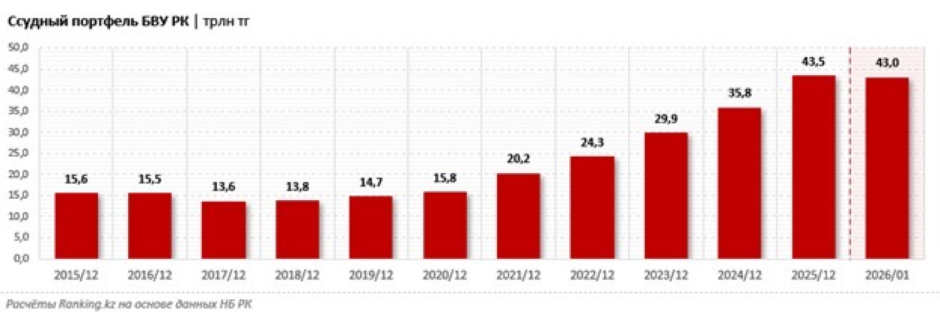 В январе 2026 года кредитный портфель банков второго уровня Казахстана немного уменьшился на 1,1 процента, составив 43 триллиона тенге. Однако Bank RBK показал положительную динамику, увеличив портфель на 1,9 процента и поднявшись на 6-е место по объёмам ссудного портфеля.