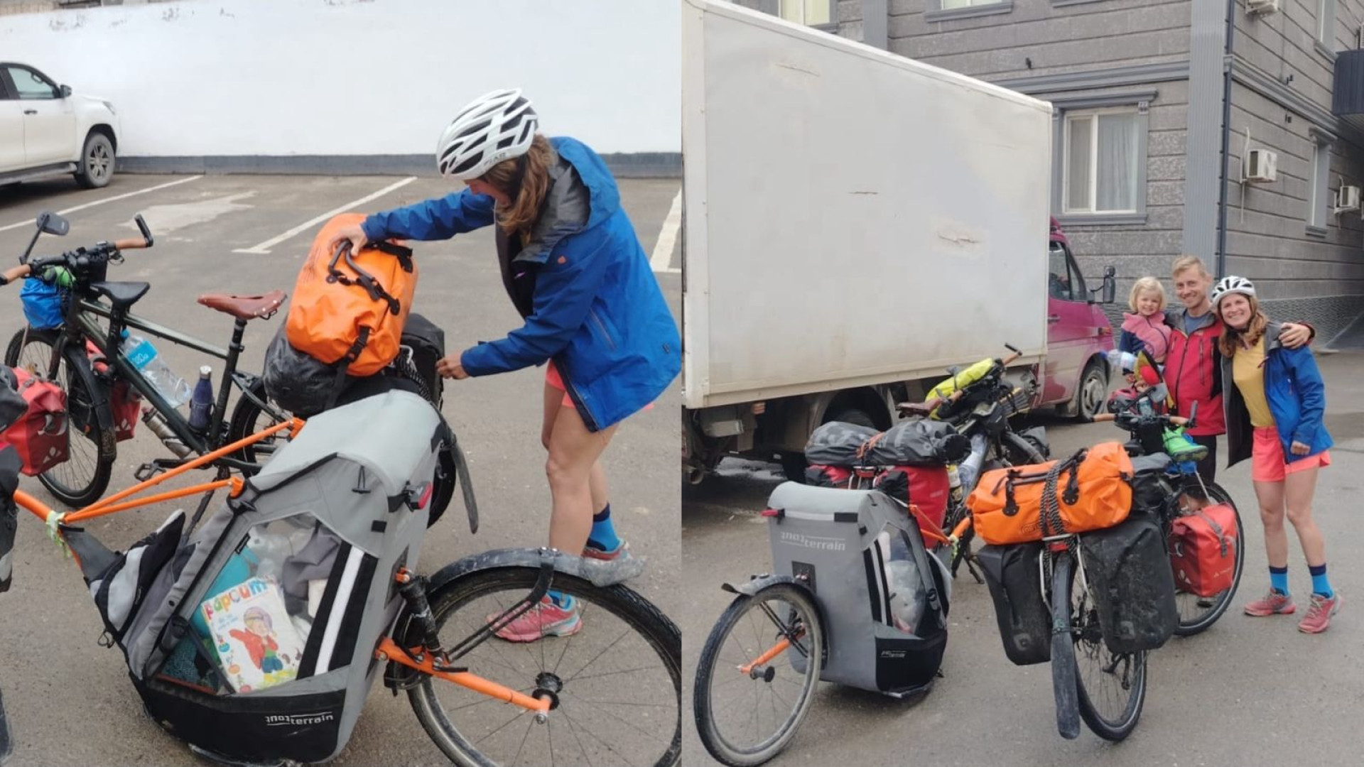 Судя по всему, семья путешествовала по региону на велосипедах и попала под сильный дождь прямо на трассе.