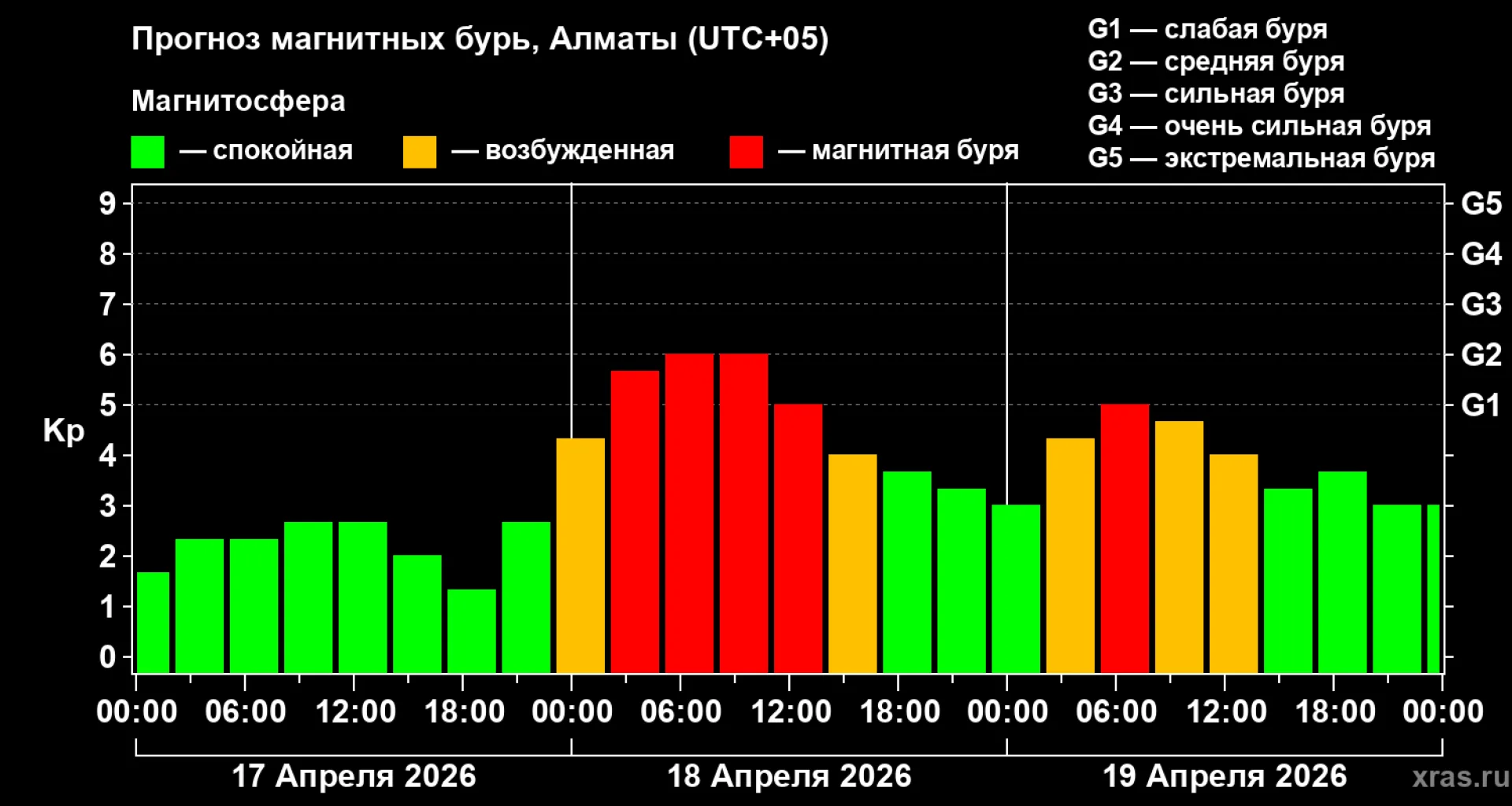 В Алматы вероятность магнитной бури достигает примерно 90 процентов в первый день и 70 процентов — во второй.