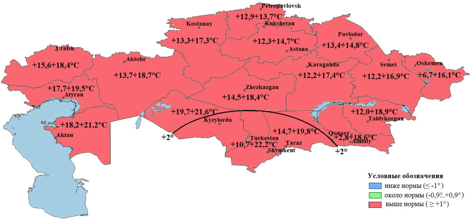 В большинстве регионов Казахстана среднемесячная температура в мае прогнозируется в пределах +14…+19 градусов. На юго-западе, юге и крайнем юго-востоке ожидается более тёплая погода — от +20 до +24 градусов. В горных районах юго-востока и востока страны температура составит около +12…+14 градусов. Отклонение от климатической нормы составит +1…+2 градуса в сторону повышения.