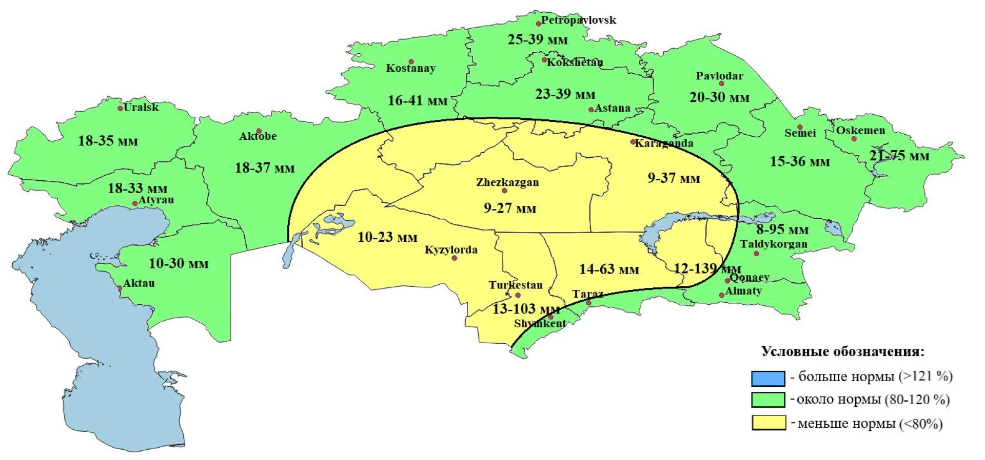 В целом по Казахстану количество осадков ожидается около нормы. Меньше нормы прогнозируется в ряде регионов, включая Кызылординскую область, область Улытау, части Карагандинской, Туркестанской и Жамбылской областей, а также отдельные территории юга и юго-востока страны.