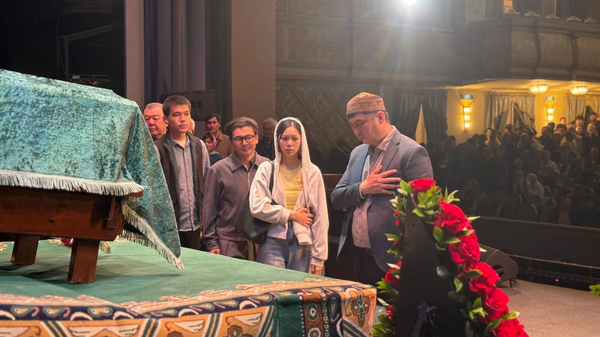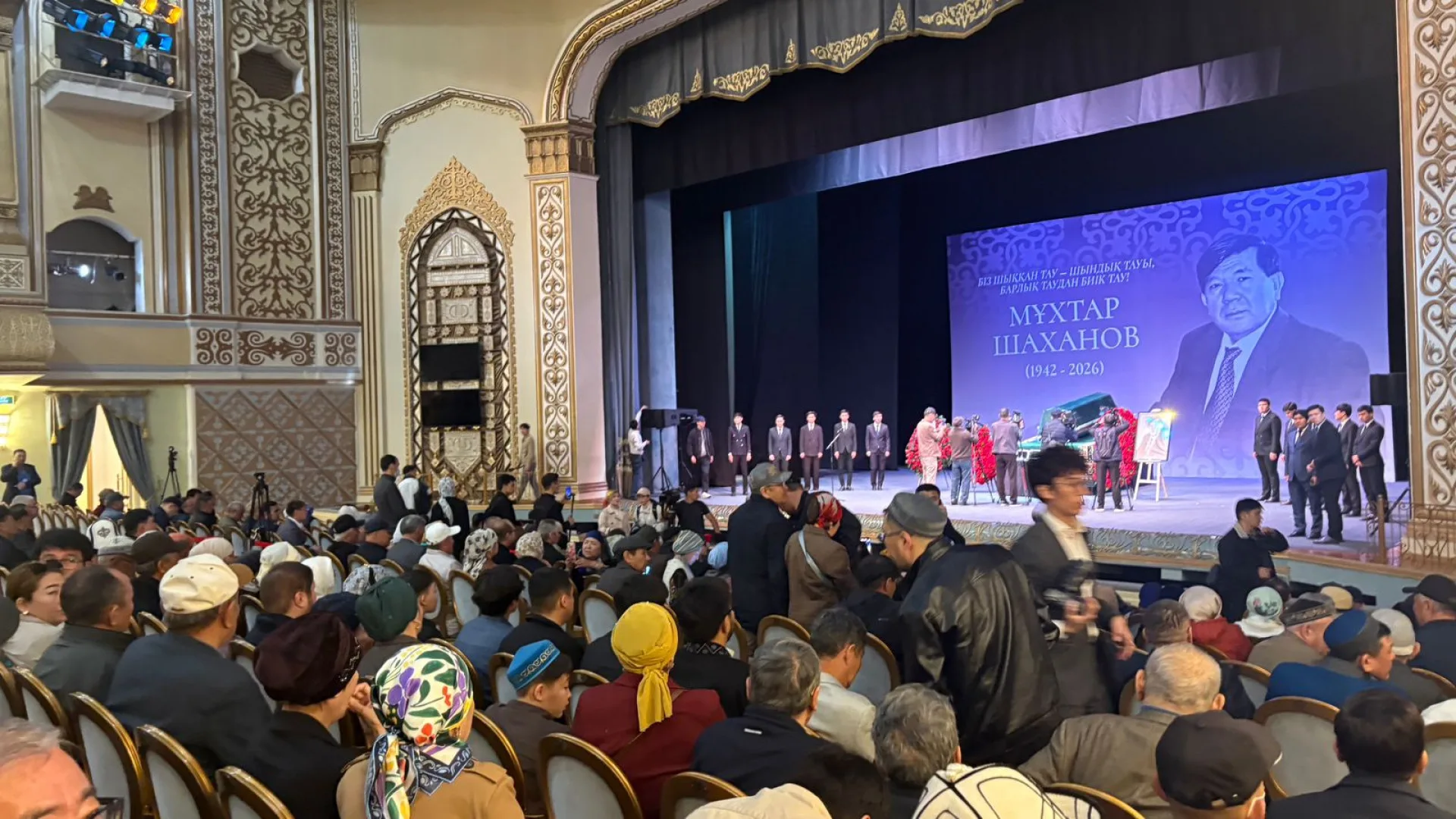 Тысячи людей пришли попрощаться с Мухтаром Шахановым. Очередь к зданию театра начала формироваться с раннего утра. К началу церемонии зал оказался полностью заполнен: люди стояли в проходах, фойе и даже на ступенях у входа.