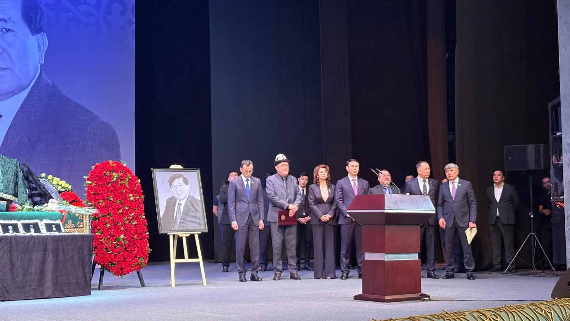 Тело поэта вынесли в большой зал КазНАТОБ, рядом были размещены его государственные награды и памятные знаки.